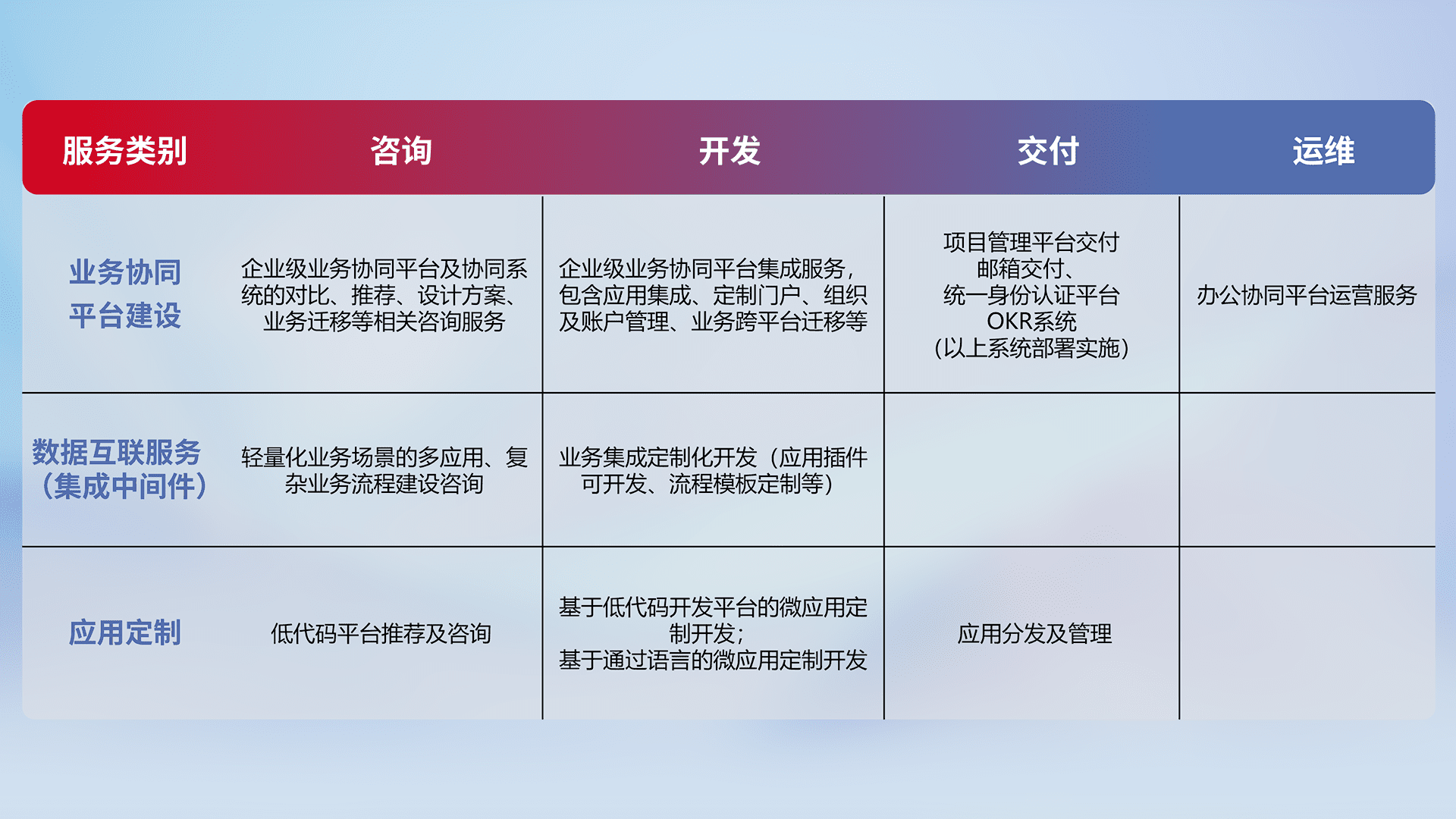 针对钉钉、、、、企微、、IDaas等平台级产品提供产品的规划、、方案、、、交付、、定制化开发等服务,,实现如统一协同办公、、、智能客户服务、、混合会议管理、、、智能数据查询、、、等业务场景,,,,实现数字化转型。。。。