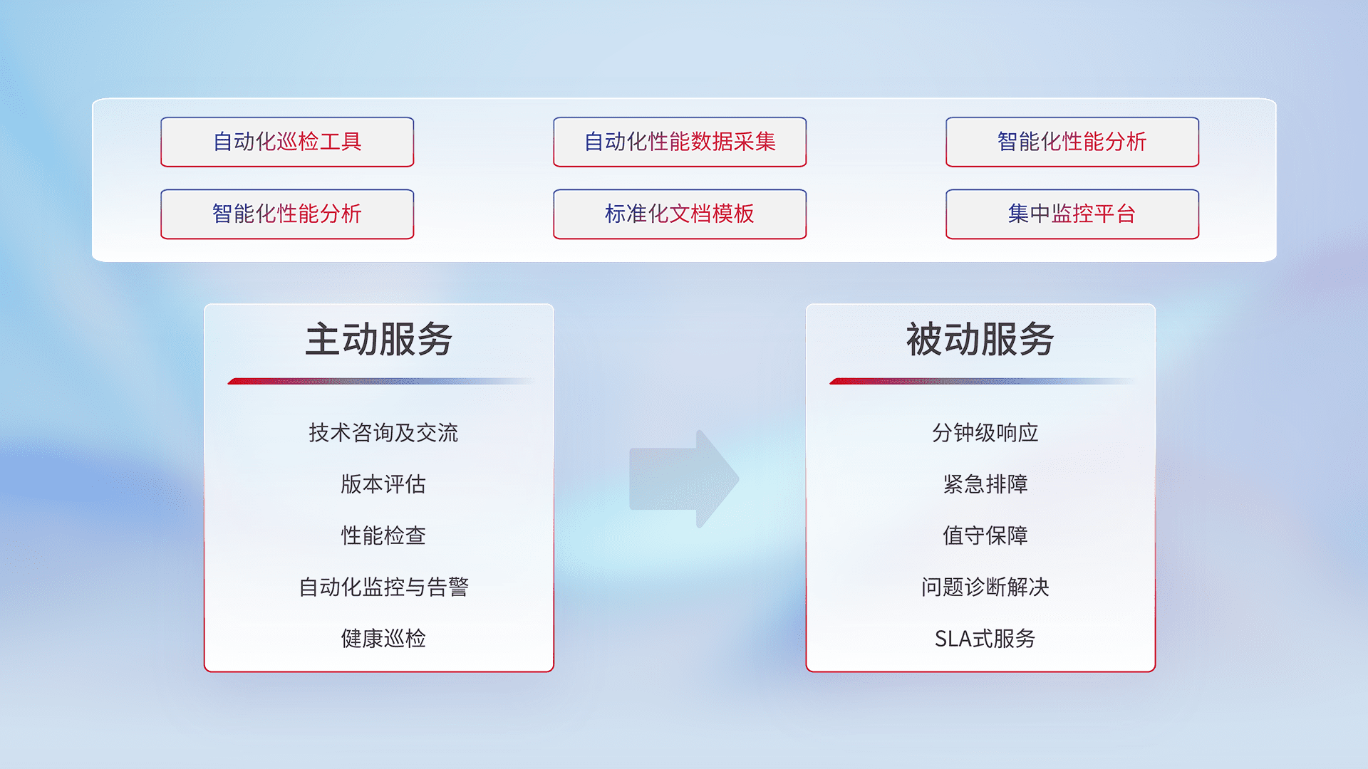 智能化工具和标准化文档,,保障服务质量,,提供主动服务(包含技术咨询、、、版本评估、、、、性能检查、、、、自动化监控与告警、、、健康巡检)和被动服务包含(分钟级响应、、、、紧急排障、、、、值守保障、、问题诊断解决、、、、SLA服务)。。。